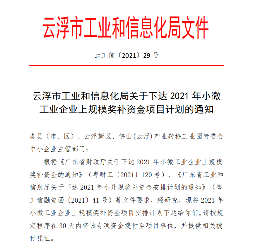 公司入库 2021年促进小微工业企业上规模发展资金项目